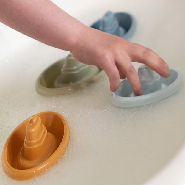 Ahoy kapitein! Maak van badderen het allerleukste moment van de dag met deze superleuke set badbootjes. De vrolijke vloot bestaat uit 4 verschillende kleuren en zorgt voor het nodige entertainment in bad. Laat de bootjes door de badkuip drijven, vul ze met water of stapel ze allemaal op elkaar. De kleurrijke badbootjes van Little Dutch prikkelen de verbeelding van je kleintje zowel in het water als op het droge.