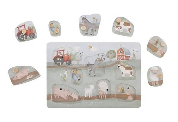 Dit is geen gewone puzzel. Wanneer je bij deze puzzel een stukje terugplaatst dan speelt er zich een geluid af. Wanneer je de puzzelstukjes optilt dan gebeurt er niets. Kijk en ontdek wat er allemaal te vinden is op deze puzzel. Deze puzzel heeft 7 verschillende geluiden. Je stimuleert met deze geluidenpuzzel de coördinatie en de woordenschat.