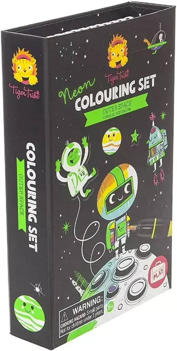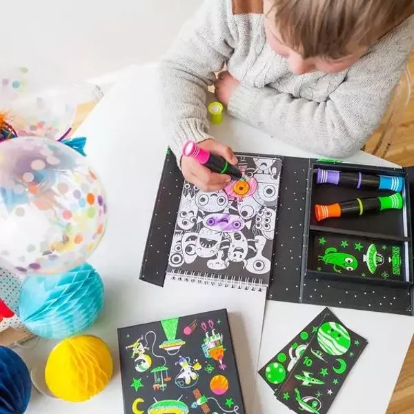In dit stevige opbergdoosje vind je een boekje met 36 pagina's met tekeningen om in te kleuren, 3 dubbelzijdige stiften en 5 stickervellen. Voor urenlang teken plezier.