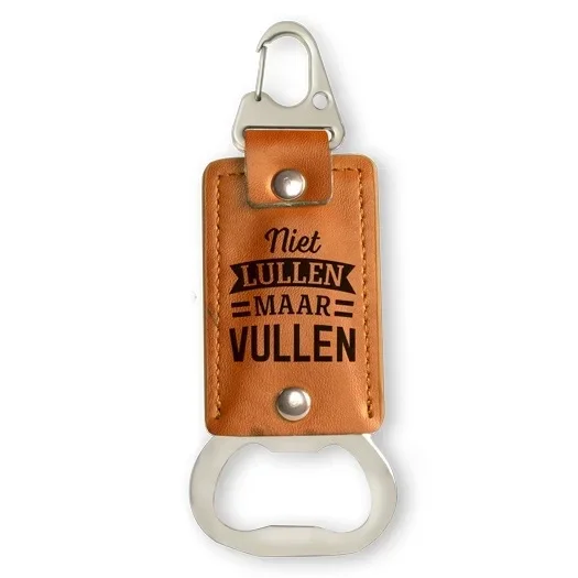 Deze stoere opener is een leuk cadeau met een persoonlijke touch eraan vast door de tekst die erop staat. De tekst wordt gebrand in het leer door middel van hot stamping. Bovenaan de opener zit een sluiting, zodat je hem ook ergens aan vast kan maken of kan ophangen.