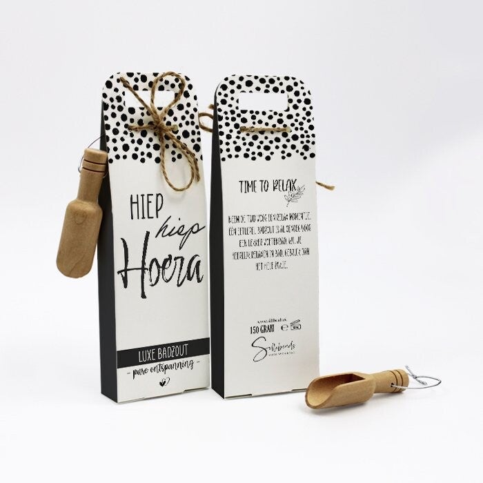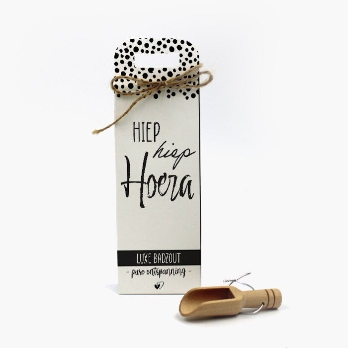 Deze luxe badzout is heerlijk voor een relax momentje met pure ontspanning. Alle verpakkingen zijn voor elke gelegenheid ontworpen met lieve, leuke en warme teksten. Daarnaast is het mooi gepresenteerd in een hippe zwarte witte verpakking met een houten schepje eraan vast gemaakt. Het zakje badzout bestaat uit een grove korrel met een frisse verrassende geur. Eén lepel badzout is al genoeg voor een lekker voetenbadje. Wil je heerlijk relaxen in bad, gooi dan het hele zakje badzout in bad.