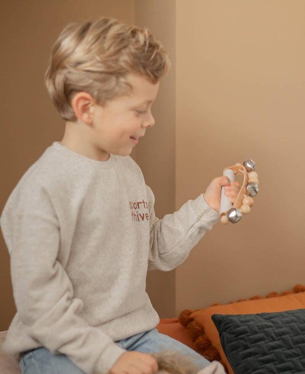 Laat je kindje kennis maken met deze leuke muziekinstrument. De houten rammelaar is er in de kleur nougat. Laat je kindje de rammelaar vasthouden en er dan gewoonweg mee laten schudden. De belletjes die eraan zitten doen dan hun werk. De rammelaar kun je dus al aanbieden wanneer je kindje al dingen kan vastpakken.