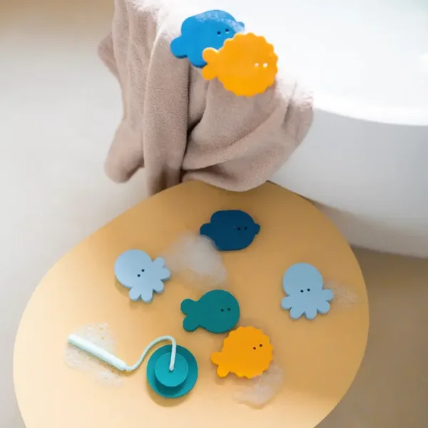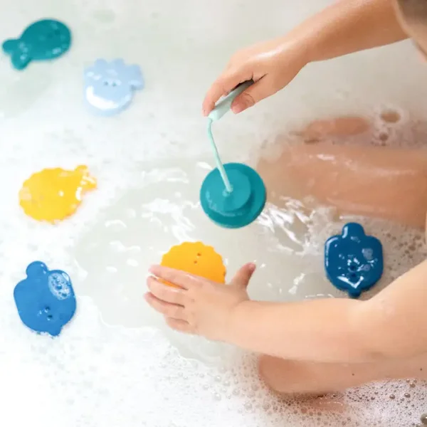 Vanaf 10 maanden spelen kinderen met drijvende schuimblokjes die aan de badkuipmuren blijven plakken. Op 18 maanden vissen ze met de meegeleverde hengel – geen magneten nodig! Deze vormen blijven drijven op het water, wat de verbeelding stimuleert en de coördinatie verbetert.