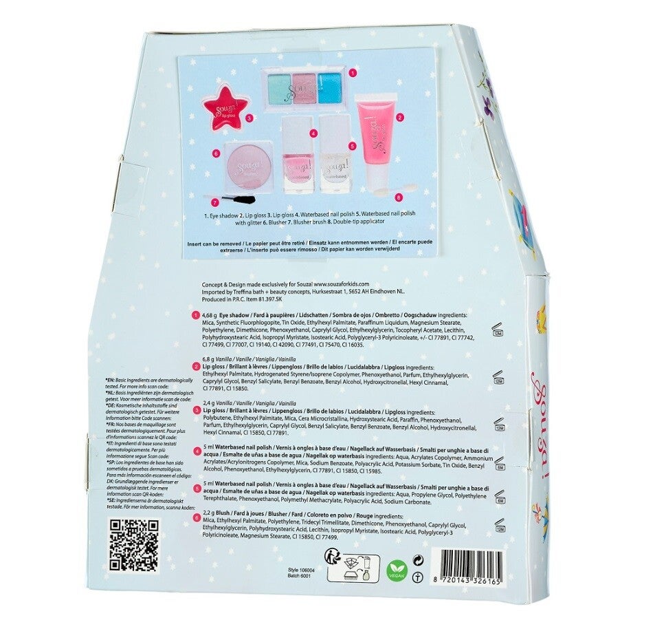 Deze make-up set is vegan en dermatologisch getest. De nagellak is op waterbasis.