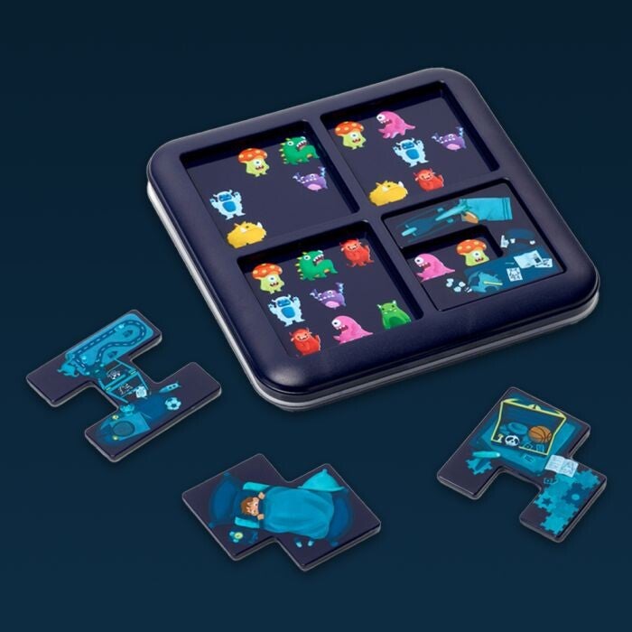 Zitten er monsters onder het bed? Plaats de 4 puzzelstukken op het spelbord, zodat alle monsters verborgen worden, behalve diegene die in de opdracht afgebeeld zijn. Monsters Hide & Seek is een reisspel met 60 opdrachten, van makkelijk tot moeilijk. Kies een opdracht en plaats de 4 puzzelstukken op het spelbord, zodat alle monsters verborgen worden, behalve diegene die in de opdracht afgebeeld zijn.