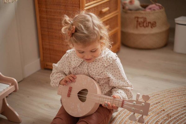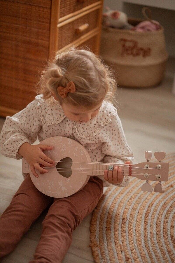 Laat je kindje kennis maken met leuke muziekinstrumenten. Deze leuke banjo is er in de kleur roze. De banjo heeft als aankleding leuke libellen en bloemen erop staan. De stemknoppen zijn in de vorm van een hartje.