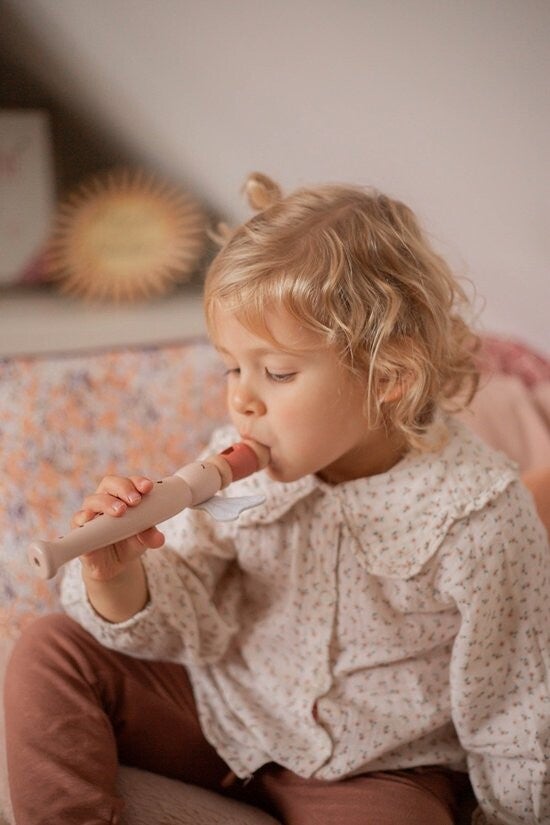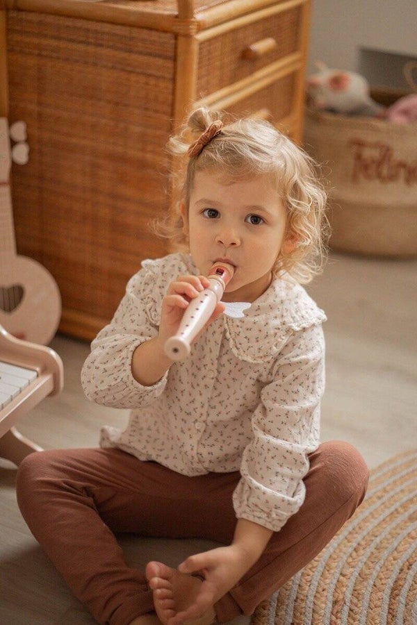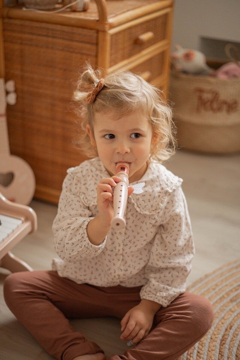 Laat je kindje kennis maken met deze leuke muziekinstrument. De houten fluit is er in de kleur roze. Laat je kindje de vingers op de gaatjes houden en bovenin blazen. Door te wisselen met de vingers op de gaatjes dan krijg je verschillende toonhoogtes. Zo kan je kindje zelf zijn eigen muziek maken.