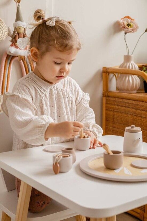 Met de teaset kun je heerlijke thee zetten. Alles wat je nodig hebt zit erbij. Laat je kindje voor jou een heerlijke kopje thee zetten of maak er een gezellig onderonsje van. De fantasie van je kind word goed gestimuleerd met deze mooie theeset.