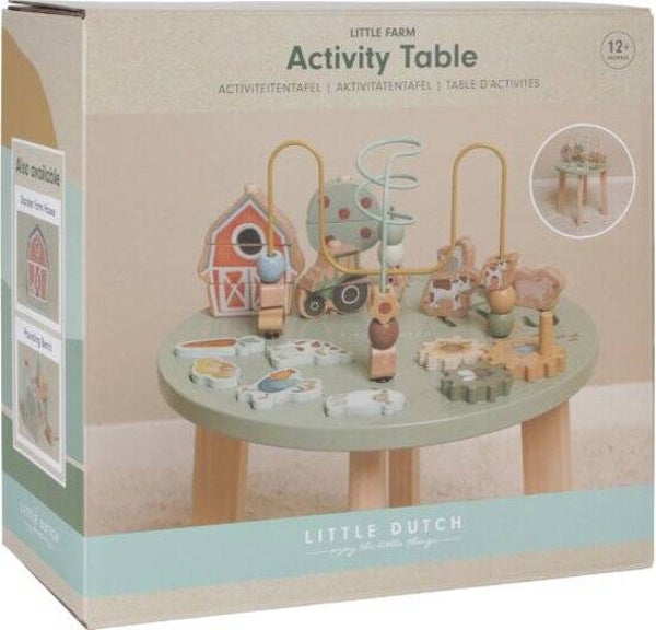 Sta op en speel! Ontdek alle activiteiten die deze tafel te bieden heeft. Breng de kralen van de ene naar de andere kant van de spiraal. Of bouw de boerderij. Maak de puzzel, draai aan de tandwielen en beweeg het schaapje, koetje en kipje. Deze houten activiteitentafel daagt je kleintje op vele manieren uit. Er zijn 5 activiteiten om te ontdekken, die elk de ontwikkeling van fijne motoriek ondersteunen. Dankzij het veilige en uitgebalanceerde ontwerp stimuleert de activiteitentafel ook het opstaan. Én het blijven staan! Want al die speelfuncties zullen je peuter een tijdje bezig houden. Te monteren door een volwassene.