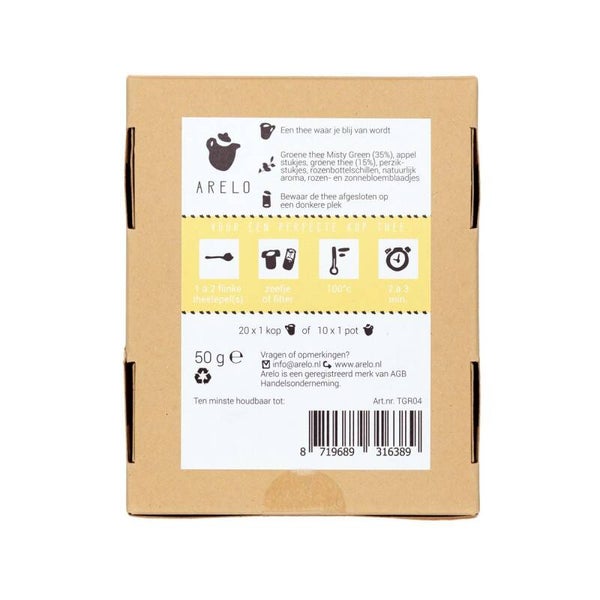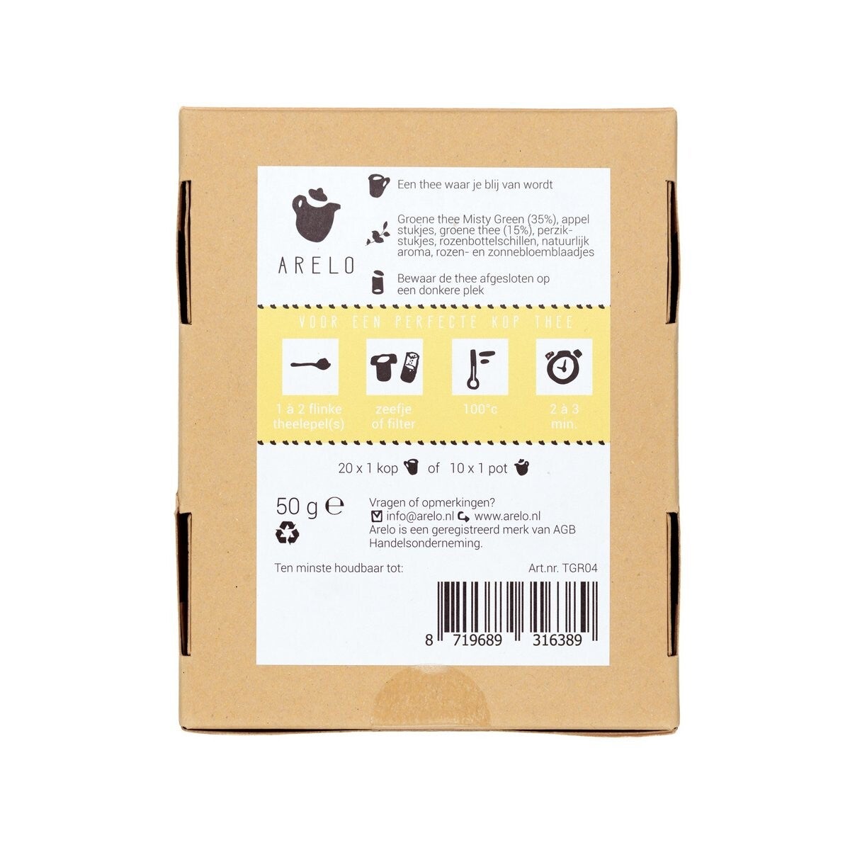 Ingrediënten: Groene thee Misty Green (35%), appelstukjes, groene thee (15%), perzikstukjes, rozenbottelschillen, natuurlijk aroma, rozen- en zonnebloemblaadjes