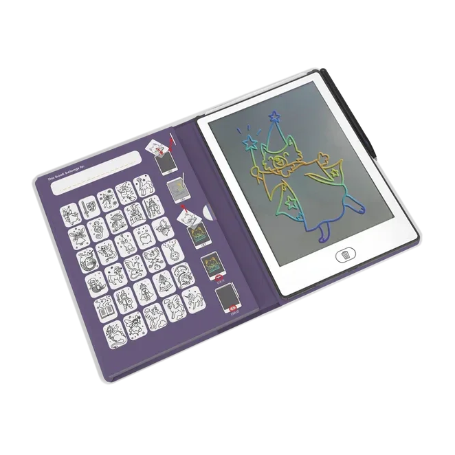 Dit tekentablet is net wat anders dan andere tablets. Je kunt er vrij op tekenen met het speciale pennetje dat erbij geleverd word, maar je kunt ook kiezen uit een van de 30 illustraties die erbij zitten. Je kunt ze bovenin erin steken en dan kunnen ze de afbeelding overtrekken. Ben je klaar met de afbeelding of is het niet helemaal wat je wilde dan kun je op het prullenbakje klikken onderin en dan word je tekening verwijderd. De illustraties kun je mooi bewaren in het mapje aan de linkerzijde van je tekentablet. Ze worden netjes bij elkaar gehouden door een elastiek. Er zit ook een vergrendeling op de tablet om zo je tekening op te slaan.