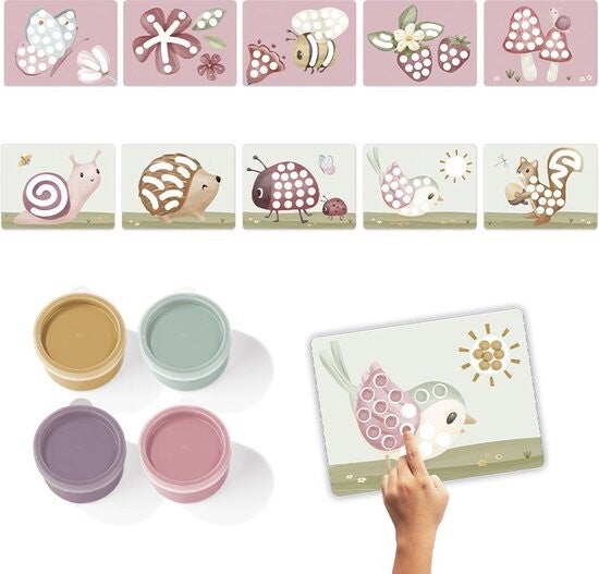 Laat je kleintje spelenderwijs de natuur ontdekken met de vingerverfset uit de Fairy Garden serie. Deze kleurrijke set is speciaal ontworpen voor kleine handjes en nodigt je kleintje uit om zijn of haar creativiteit de vrije loop te laten. Met vier zachte tinten en schattige voorgedrukte kaartjes van bijvoorbeeld een lieveheersbeestje of mooie vlinder kan je kindje meteen aan de slag om de mooiste kunstwerkjes te maken. De verf is veilig en makkelijk uitwasbaar, ideaal voor uren knutselplezier. Terwijl je kleintje de kaarten vult met de kleurrijke verf, stimuleert het de ontwikkeling van de fijne motoriek, oog-handcoördinatie en creativiteit. Laat hun fantasie opbloeien terwijl ze spelenderwijs de wonderen van de Fairy Garden tot leven brengen.