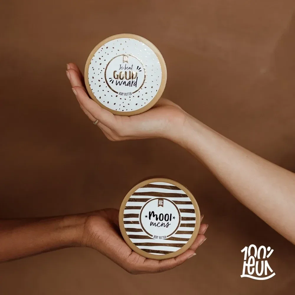 Een compliment geven, doen we dat wel genoeg? Met weinig woorden iemand een glimlach bezorgen, dat is goud waard! Deze bodybutter is een mooi compliment om te geven aan je liefste moeder, oma of vriendin. De bodybutter heeft een romige textuur, wat voor een beschermende laag op de huid zorgt. Hierdoor biedt het een langdurige verzorging en hydratatie, zonder vettig aan te voelen. de fijne zachte geur van sheabutter maakt dit item een 100%LEUK om te geven en krijgen. Tip: LEUK cadeau voor moederdag! De bodybutter is vegan.