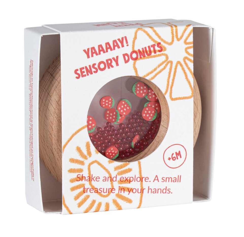 Deze sensorische donut is van het Spaanse merk Petit Boum. De donut is gevuld met kralen en aardbeien. De kralen en tomaatjes rammelen als ermee geschud wordt. Het beukenhout is antibacterieel en hierdoor ook te gebruiken als bijtspeelgoed wat fijn is bij doorkomende tandjes. Het is dus een 2 in 1. Een rammelaar en bijtspeelgoed.