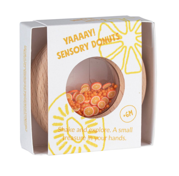 Deze sensorische donut is van het Spaanse merk Petit Boum. De donut is gevuld met kralen en sinaasappels. De kralen en tomaatjes rammelen als ermee geschud wordt. Het beukenhout is antibacterieel en hierdoor ook te gebruiken als bijtspeelgoed wat fijn is bij doorkomende tandjes. Het is dus een 2 in 1. Een rammelaar en bijtspeelgoed.