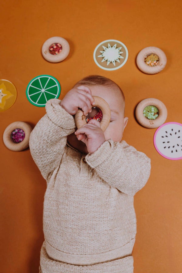 Deze sensorische donut is van het Spaanse merk Petit Boum. De donut is gevuld met kralen en druiven. De kralen en tomaatjes rammelen als ermee geschud wordt. Het beukenhout is antibacterieel en hierdoor ook te gebruiken als bijtspeelgoed wat fijn is bij doorkomende tandjes. Het is dus een 2 in 1. Een rammelaar en bijtspeelgoed.