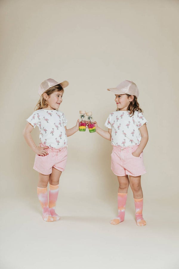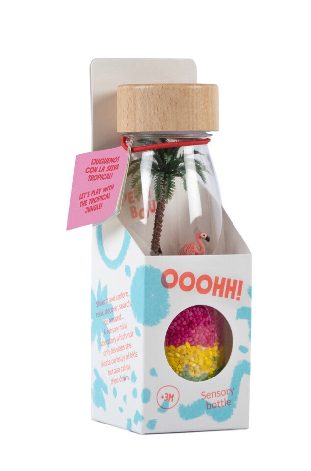 Kijk, Schud en luister naar deze sensorische fles. In de fles zit een palmboom, een flamingo, een cocosnoot, een drinkfles, een slipper en kleine figuurtjes. Zoek alle elementen in de fles door te schudden met de fles.