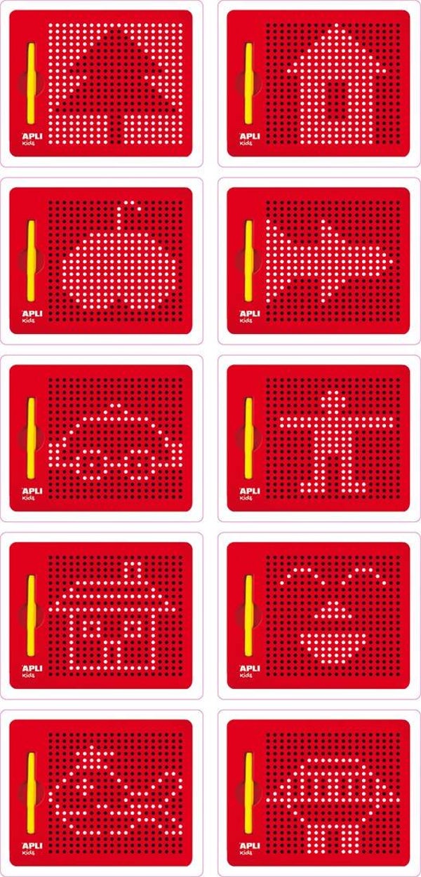 Dit tekenbord is net wat anders dan de andere tekenborden in ons assortiment. Het is namelijk een magneetbord. Er zitten allemaal kleine magneetbolletjes in het bord verwerkt. Ze komen omhoog als je met de bijgeleverde pen over de gaatjes gaat. Op deze manier kun je zelf een afbeelding maken. Er zitten ook 10 kaarten bij waarop 20 voorbeelden staan afgebeeld die je na kan tekenen. Wil je de bolletjes weer weg hebben om een nieuwe afbeelding te maken of je hebt een foutje gemaakt in je tekening, dan kun je gewoon met de vinger de magneetbolletjes als het ware naar bedenen duwen. Dan verdwijnen ze vanzelf weer en kun je weer verder tekenen.