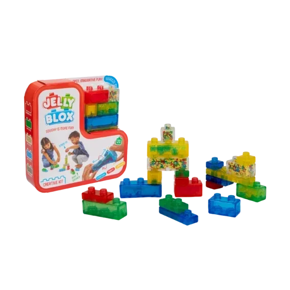 Laat de verbeelding van kinderen tot leven komen met Jelly Blox Creative Kit! Met de Jelly Blox kunnen kinderen niet alleen bouwen, maar ook kunnen ze er in knijpen en zelfs platdrukken. Sommige blokken zijn gevuld met materialen zoals zand, blokjes of schuimballetjes die de zintuigen stimuleren en de sensorische tactiliteit bevorderen. Met deze set kan je een mooie wagen bouwen.