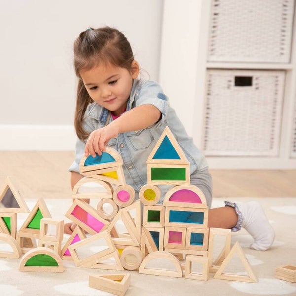 Tickit Rainbow Blocks zijn verschillende rubberhouten vormen met kleurrijke transparante acrylcentra. De transparantie van het acryl laat licht door en creëert een visueel verbluffend effect om de verbeelding van uw kind te boeien. Ideaal voor het leren over vormen, kleurenmenging of eenvoudig blokken bouwen en zijn prachtig te gebruiken op een lichtpaneel.