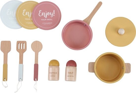 Wat ben je aan het koken, kleine chef-kok? Bereid de lekkerste gerechten in deze schattige houten keuken. Verwen je familie of je favoriete poppen en knuffels met een zelfgemaakte maaltijd. Met de twee pannen en het keukengerei ben je er klaar voor om een meesterkok te worden! De keuken biedt alles wat je maar kunt bedenken. Je kunt een taart bakken in de oven, wat groenten koken op het fornuis en, niet te vergeten, je handen wassen in de gootsteen. Er is zelfs een peper- en zoutstel en een kast om je boodschappen in op te bergen. Peuters houden ervan om volwassenen en hun dagelijkse routines na te bootsen. Deze keuken zal een droom zijn die uitkomt voor kleine chef-koks. Het inspireert rollenspel, creativiteit, motoriek en verbeelding. De stevige houten keuken in moderne kleuren creëert een heerlijke speelruimte in een kinderkamer maar staat ook prachtig in een woonkamer. Combineer met de weegschaal of broodrooster en maak het rollenspel compleet.