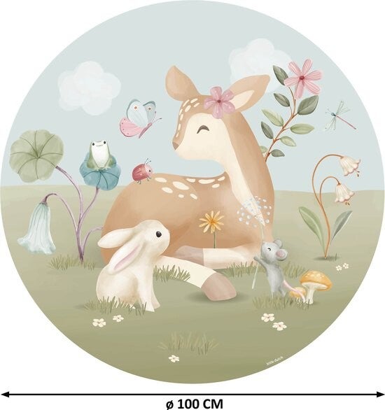 Breng de fleurige sfeer van Fairy Garden naar de kinderkamer met deze prachtige behangcirkel in Fairy Garden thema! Ontdek een betoverende scène met een lief hert, nieuwsgierig konijn, kleurrijke bloemen, speelse paddenstoelen, fladderende vlinders en kwakende kikkers. Deze behangcirkel is gemaakt van hoogwaardig materiaal met een matte afwerking, perfect om je kamer op te fleuren. Eenvoudig aan te brengen op een gladde muur en net zo makkelijk weer te verwijderen zonder sporen achter te laten. Voeg een vleugje natuurlijke charme toe aan elke ruimte met deze betoverende Fairy Garden behangcirkel!