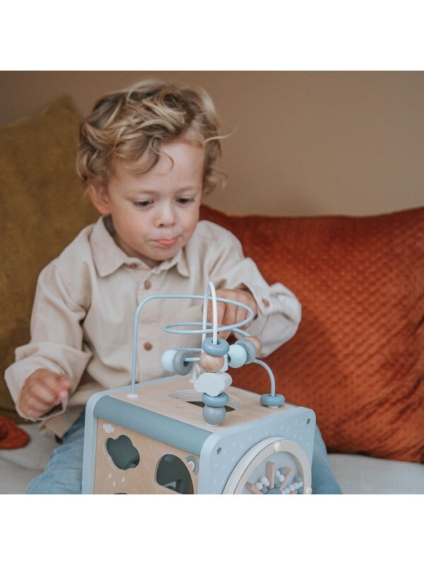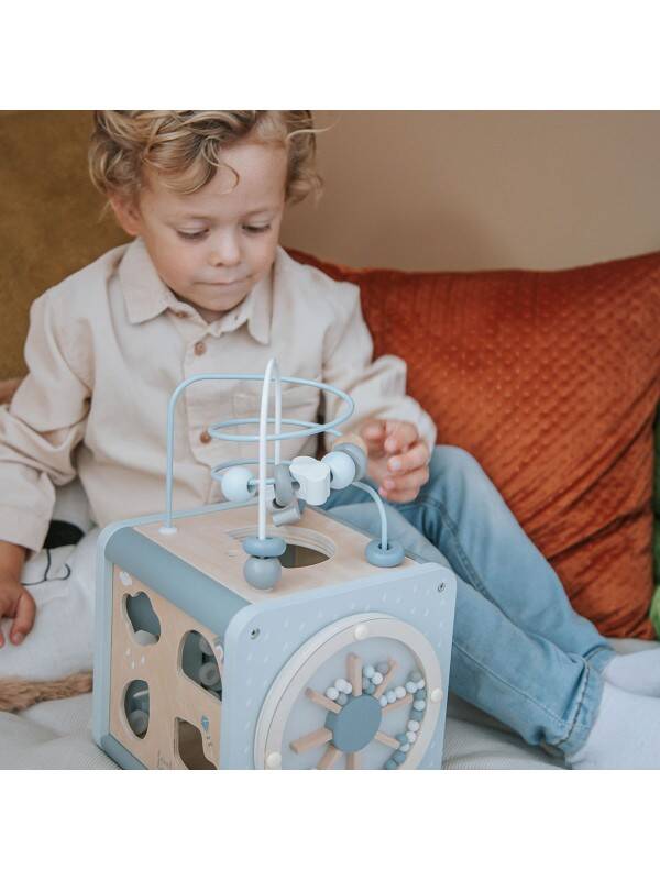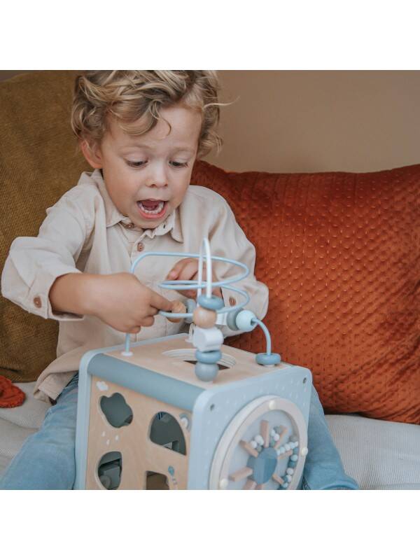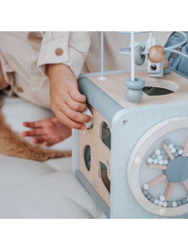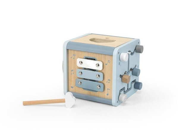De activiteitenkubus heeft aan elke kant een andere activiteit, die naast uren speelplezier ook bijdragen aan de ontwikkeling van jouw kindje. Hij draagt bij aan het stimuleren van de hand- en oogcoördinatie, het oplossend denkvermogen van je kindje en vormherkenning. De bovenkant van de kubus kan worden losgehaald, zodat je een losse kralenspriaal hebt.