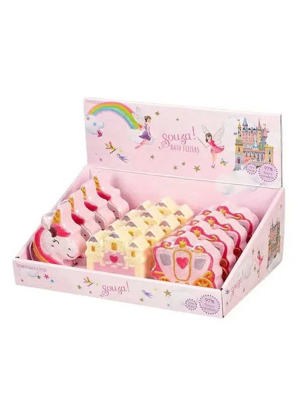Met deze bathfizzers word badderen zoals nooit tevoren. Je kunt ze gewoon in het water gooien en ze lossen vanzelf op. We hebben de bathfizzers in drie vormen. De koets, eenhoorn en het kasteel. Merk: Souza!Vorm: Koets