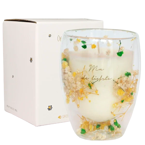 Deze luxe geurkaarsen hebben een dubbele wand waar gedroogde madeliefjes tussen zit. Een èchte eyecatcher! Deze kaars ziet er niet alleen leuk uit, als de kaars is opgebrand, kan je het glas gebruiken als theeglas bijvoorbeeld of een andere heet of koud drankje. Door de dubbele wand zorgt het glas ervoor dat je drankje warm blijft, zonder dat je handen ook heet worden.
