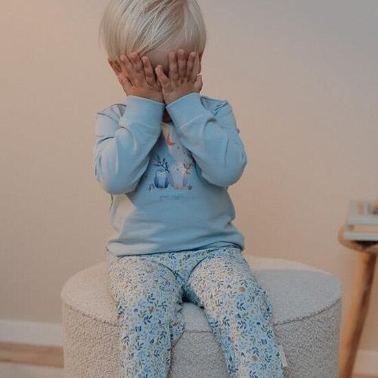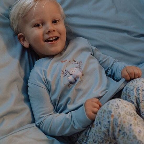 "Slaap zacht," zegt de wijze uil, "het is tijd om naar bed te gaan!" Geniet van bedtijd in deze schattige pyjama. De lichtblauwe broek heeft een charmante print van blaadjes, uiltjes en andere vondsten uit het bos, en het effen lichtblauwe shirt is versierd met een uil en zijn eekhoornvriendje. Gemaakt van biologisch katoen, is deze pyjama zacht voor je baby’s huid en perfect te matchen met de bijpassende beddengoed. De pyjama is verpakt in een mooie geschenkdoos.