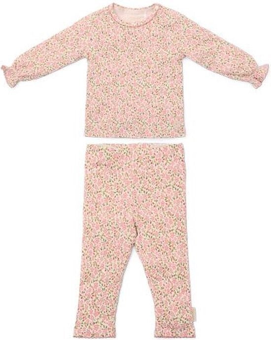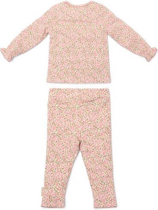 Flower Power Pyjama! Voeg een beetje Fairy Floral stijl toe aan je bedtijd met deze schattige tweedelige pyjama. Gemaakt van comfortabel ribmateriaal, heeft deze pyjama een mooie roze print versierd met schattige kleine bloemetjes. De mouwen zijn afgewerkt met frivole ruches en hebben een gestikt randje aan de zijkant voor een vleugje extra charme. Gemaakt van biologisch katoen en ontworpen om perfect bij het beddengoed te passen, is deze pyjama niet alleen stijlvol maar ook zacht en comfortabel voor de huid van je baby. Verpakt in een mooie doos, dus extra leuk om cadeau te geven.