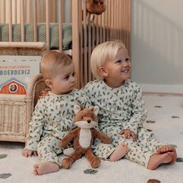 Een bosrijk dromenland: Stap binnen in een bosrijke droomwereld met deze charmante pyjama. Gemaakt van comfortabel ribmateriaal, hebben zowel het shirt als de broek een prachtige print van eikeltjes en blaadjes die de essentie van het bos weerspiegelen. Ontworpen om perfect te combineren met het bijpassende beddengoed, is deze pyjama gemaakt van biologisch katoen voor zachtheid en comfort voor je kleintje. Prachtig verpakt in een mooie doos, dus extra leuk om cadeau te geven.