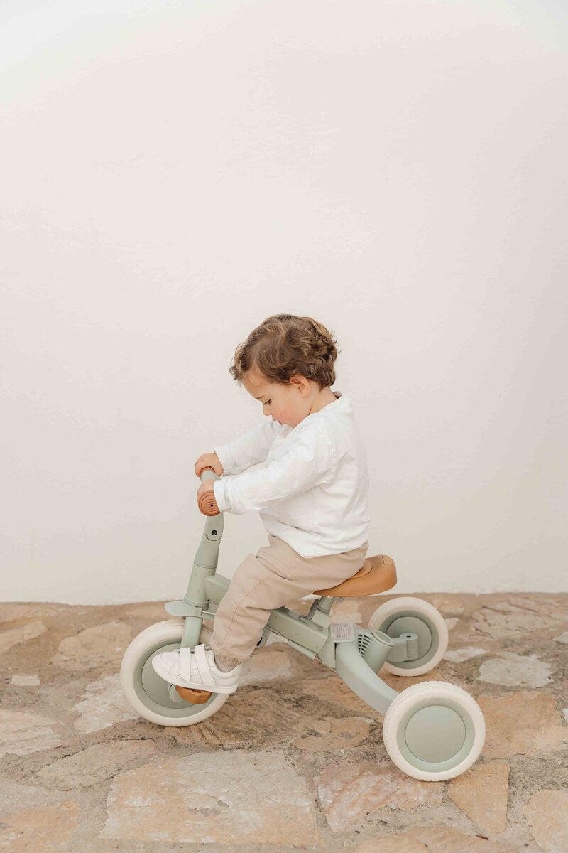 Hup, tijd om eropuit te gaan! Met deze mooie gedetailleerde zachtgroene 4-in-1 loopfiets zijn de eerste (fiets)avonturen zo gemaakt. Ideaal om spelenderwijs kennis te maken met fietsen. Kan je kleintje nog niet zelf lopen of fietsen? Geen probleem, de duwstang helpt je een handje. Veiligheid voor alles, dankzij de riem en de veiligheidsring, die gemakkelijk kunnen worden verwijderd als ze niet meer nodig zijn. Van driewieler naar loopfiets in een handomdraai - en de trappers? Die berg je slim op onder het zadel! Licht, compact en verstelbaar voor kinderen van 1 tot ongeveer 3 jaar. De maximale draagkracht is 25 kg.