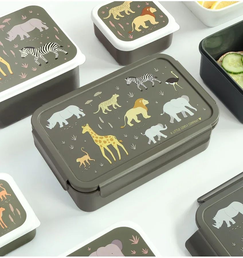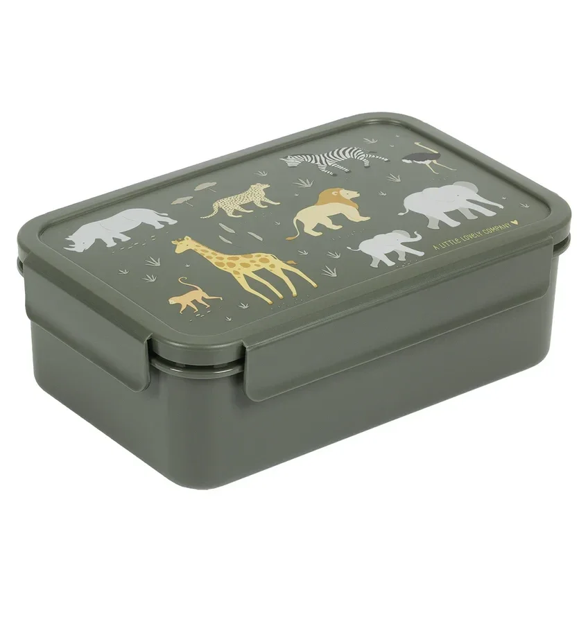 Deze ruime grijze lunchbox met safari dieren is ideaal voor een frisse en gevarieerde lunch op school of onderweg. De luchtdichte click & close deksel en uitneembare bento tray met twee compartimenten zorgen voor een perfect georganiseerde lunch.