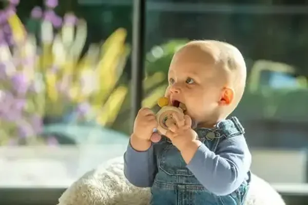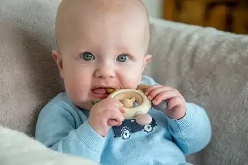 Met verschillende texturen, kleuren en een houten rammelaar in het midden, biedt deze bijtring een leuke afleiding voor jonge baby's. Het houten rammelgedeelte kan worden verwijderd om het siliconen deel te wassen.
