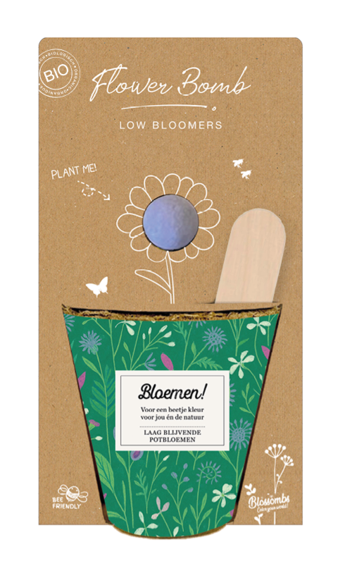 Blossombs zijn bommetjes vol wilde bloemzaadjes. Ze zijn gemaakt van natuurlijke materialen, waaronder klei en vezels. De bloemen die uit de bommetjes groeien zijn speciaal uitgezocht voor de bijen en vlinders. Zij kunnen onze hulp namelijk goed gebruiken! Blossombs hebben weinig verzorging nodig, maar zorg er wel voor (als moeder natuur dit niet doet) dat ze genoeg water krijgen. Het beste kan je ze aan het begin van het voorjaar ‘zaaien’, zodat je er 2 seizoenen lang van kan genieten.
