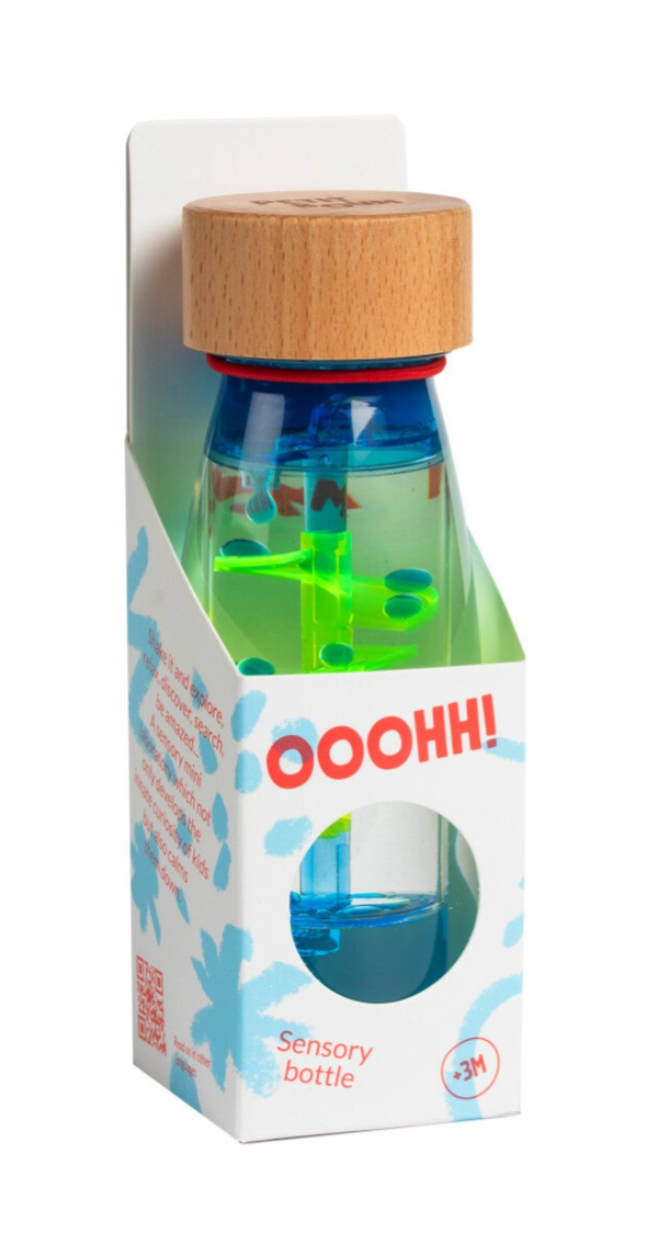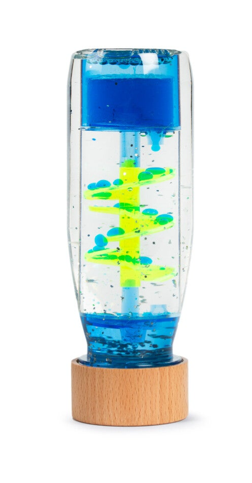De Petit Boum Sensorische Fles – Spiraal Blauw is ontworpen om kinderen op een eenvoudige en effectieve manier kennis te laten maken met visuele prikkels en beweging. In de fles zweven blauwe spiralen langzaam naar beneden zodra de fles wordt gekanteld of geschud. Dit proces trekt de aandacht en nodigt uit tot kijken, volgen en herhalen.