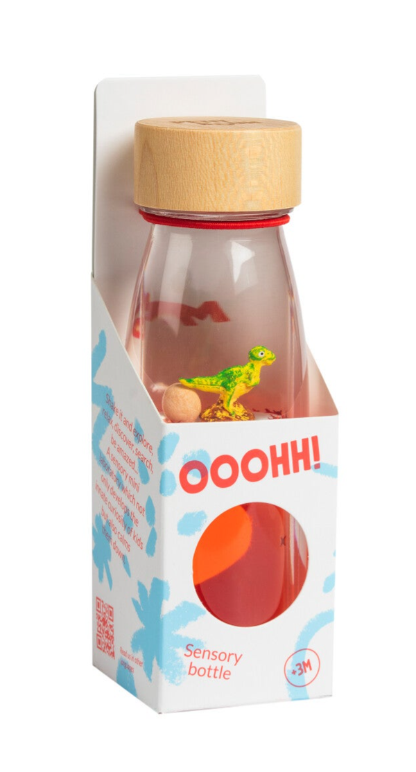 De koning der dinosaurussen is uit zijn ei gekropen… en schittert nu in onze magische sensorische move bottle! De Petit Boum Move Bottle T-rex is geen gewone fles – het is een dromenvanger in flessenvorm. In deze unieke sensorische fles zweeft een majestueuze dinosaurus te midden van een betoverend schouwspel van bubbels en kleuren. Schud de fles en zie hoe de speciale vloeistof alles tot leven wekt – een waar spektakel dat de verbeelding prikkelt en tot rust brengt. Met deze bijzondere serie vangen we dromen in flessen. Of het nu planeten, astronauten of dieren zijn – elk thema komt tot leven in een achte, zwevende dans van fantasie.