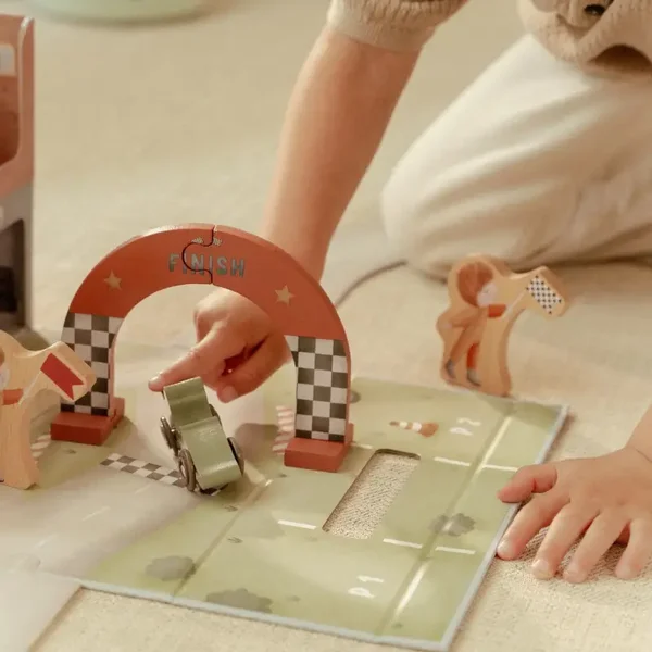 Start je motoren! Deze kartonnen speelkoffer verandert in een compleet racecircuit. De set bevat alles wat je nodig hebt voor een spannende race: raceauto’s, racecoureurs, een finishlijn, verkeersborden, een trofee en een erepodium. De kartonnen racebaan bestaat uit losse onderdelen die eenvoudig in elkaar gezet kunnen worden, net als een puzzel. Na de race berg je alles weer makkelijk op in de koffer. Klaar voor de volgende wedstrijd?