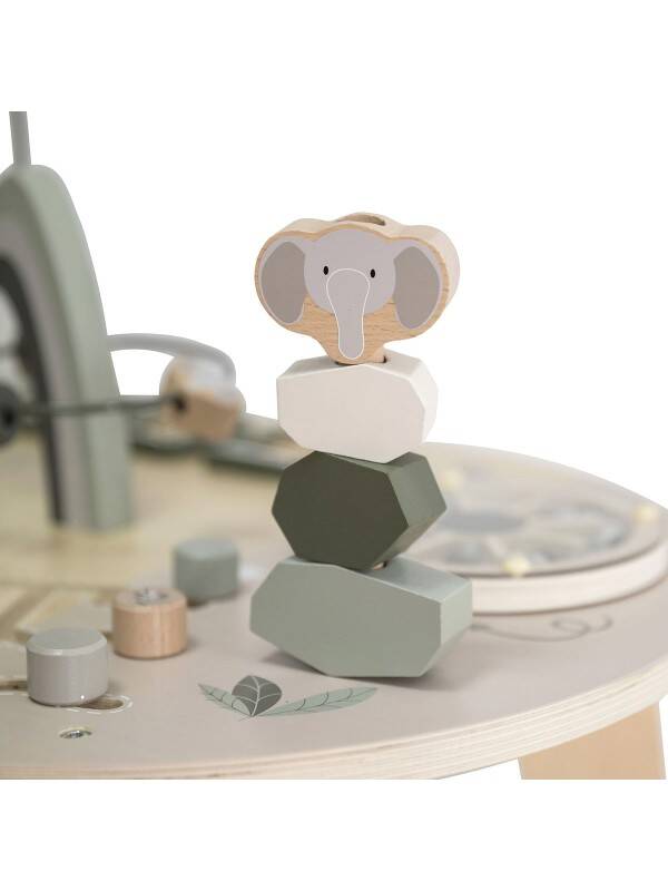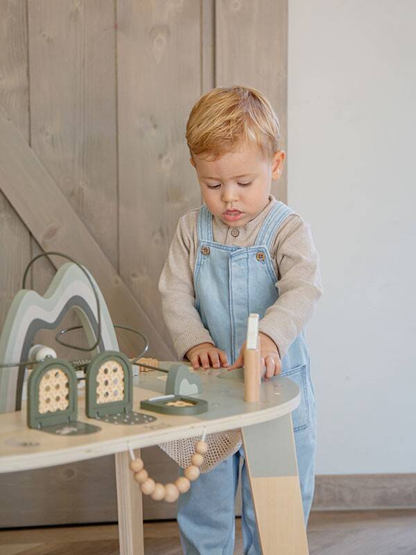 Activiteiten zoals kiekeboe-ramen, stapelblokken, vormsporter, een spiegel, kralendoolhofspiraal en nog veel meer zullen de ontwikkeling stimuleren en fantasierijk spel stimuleren. Ook word de fijne motoriek, de oog-handcoördinatie en inzicht gestimuleerd door deze activiteitentafel.