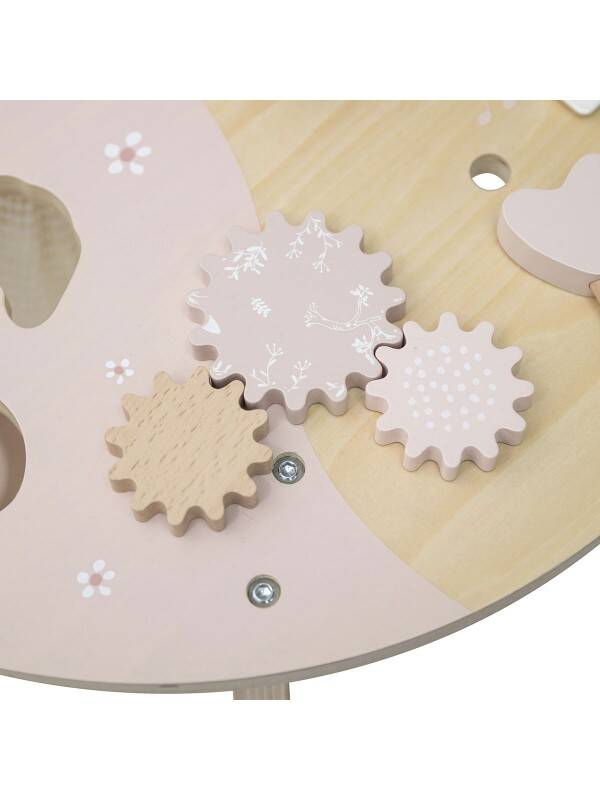 Activiteiten zoals kiekeboe-ramen, stapelblokken, vormsporter, een spiegel, kralendoolhofspiraal en nog veel meer zullen de ontwikkeling stimuleren en fantasierijk spel stimuleren. Ook word de fijne motoriek, de oog-handcoördinatie en inzicht gestimuleerd door deze activiteitentafel.