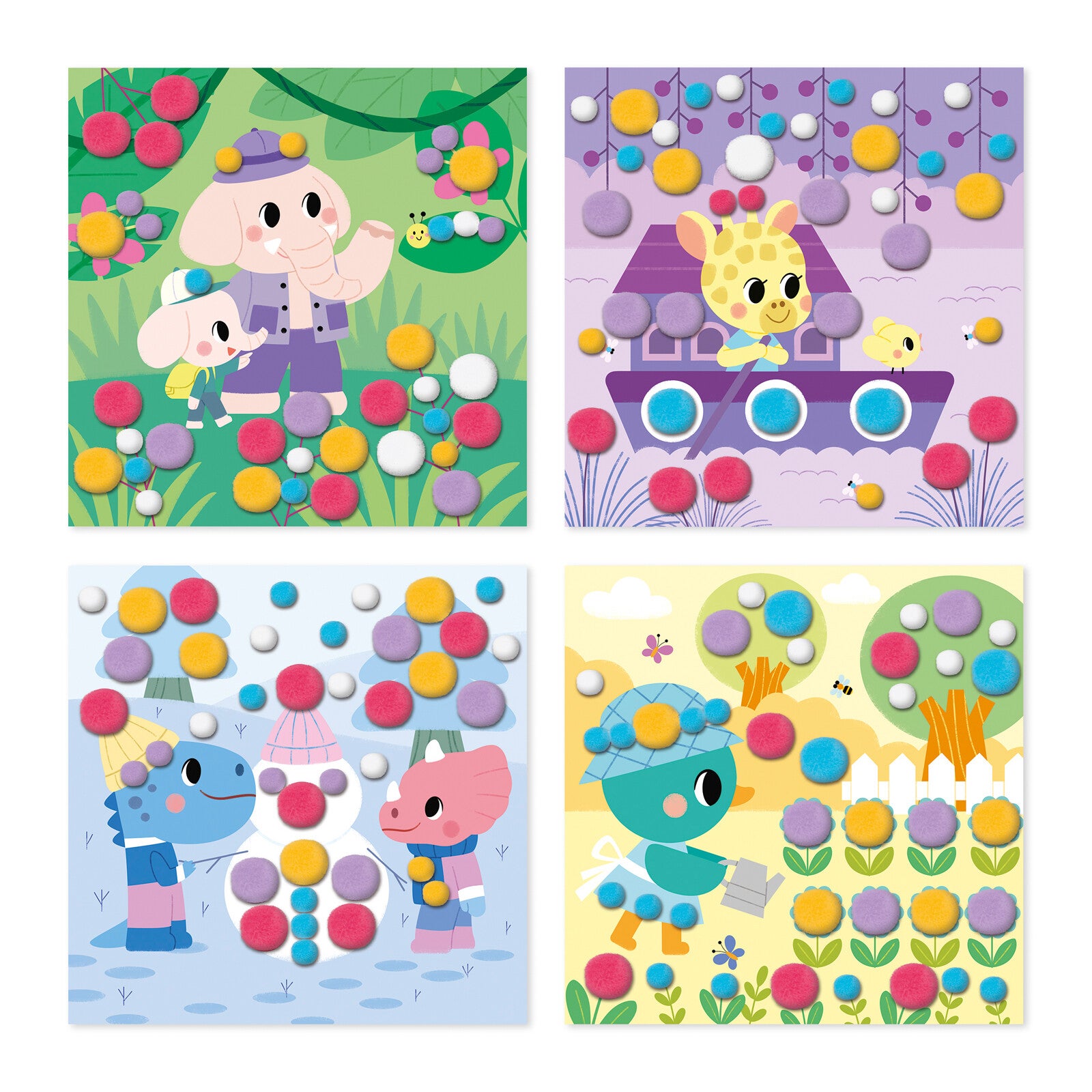 Vanaf 3 jaar kunnen kinderen al beginnen met creatieve hobby’s door bijvoorbeeld plezier te hebben met het lijmen van pompons! Een eenvoudige maar leuke activiteit, die de kleintjes al vertrouwd maakt met handmatige creaties. Deze doos bestaat uit 4 afbeeldingen om te versieren met 150 pompons in 2 maten en 5 verschillende kleuren. Het wordt geleverd met 4 fotosteunen om met de doos te maken en 150 pompons in 2 maten en 5 verschillende kleuren. Aan de hand van het instructieboekje en de gekleurde contouren van de vormen hoef je alleen maar de pompon van de juiste kleur en de juiste maat op zijn plek te plakken. De doos verandert in een schildersezel om mooie creaties in uit te stallen. Een schilderij is in ongeveer 20 minuten klaar.