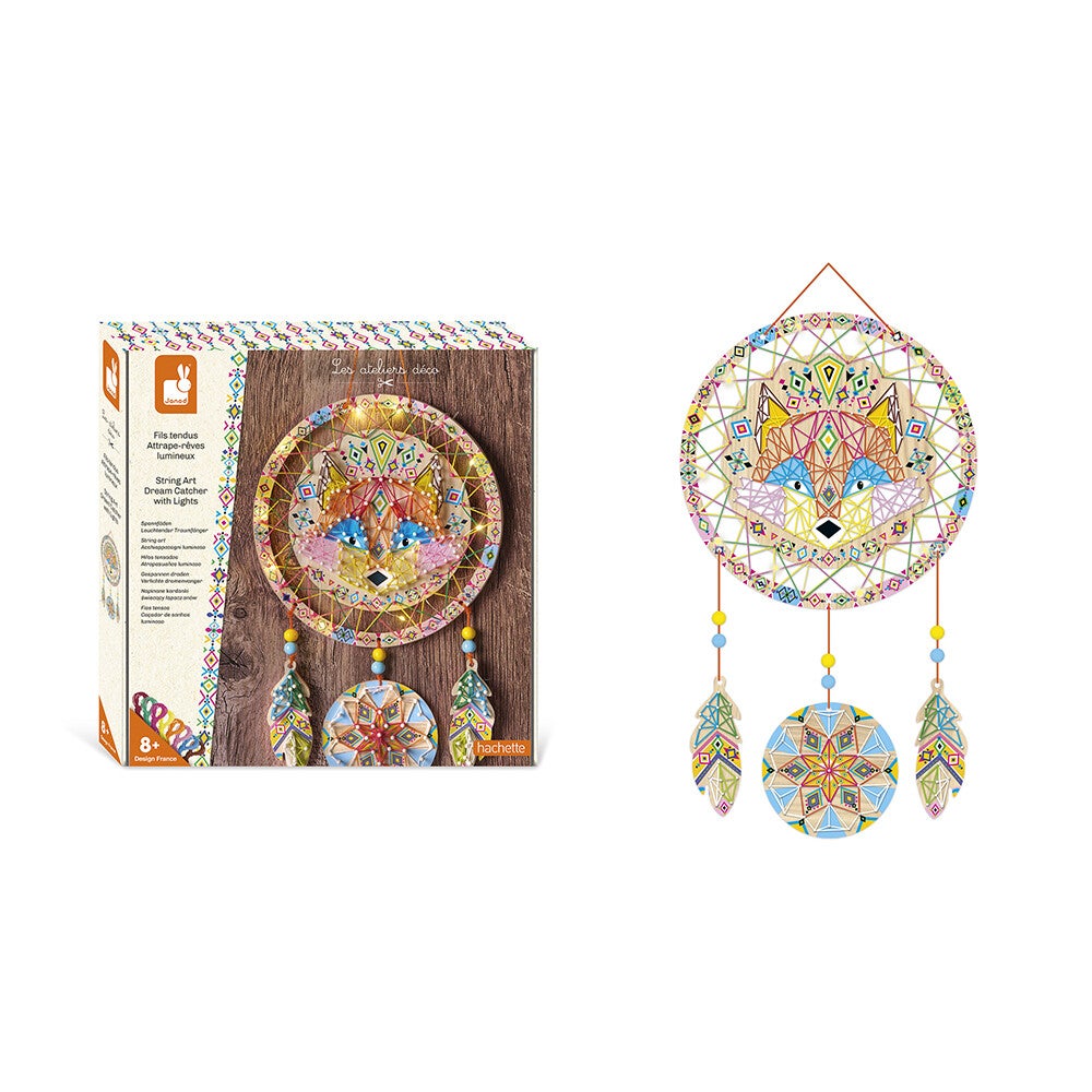 Jaag slechte dromen weg met deze mooie lichtgevende vos! Deze creatieve set laat je een prachtige dromenvanger maken met de techniek van gespannen draden. Het leukste? Het is verlicht dankzij de meegeleverde LED-lichtslinger! Deze set bevat 2 voorgestanste schuimplaten, 300 plastic spijkertjes, 10 katoendraden (7 meter), 1 juten touw (3 meter), 6 kralen, 1 lichtslinger met batterijen inbegrepen en 1 instructieboekje met stapsgewijze uitleg en een voorbeeld. Deze activiteit stimuleert creativiteit en geduld en neemt ongeveer 2 uur in beslag.