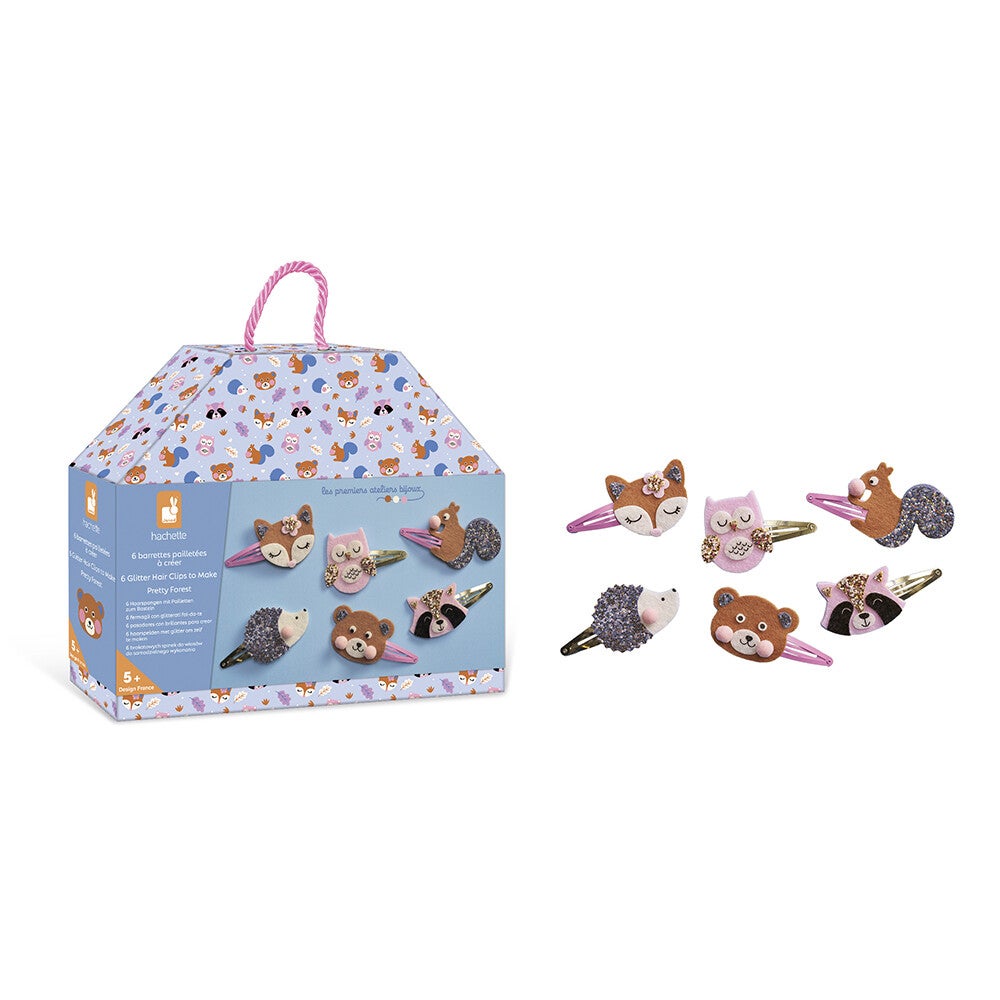 Pretty forest! Deze creatieve set laat je 6 glitter-haarspelden maken met afbeeldingen van bosdieren: een vos, een uil, een egel, een beer, een wasbeer en een eekhoorn. De mooie doos is ontworpen als een kleine draagbare tas en bevat 6 haarspelden van 5 cm, 3 voorgestanste zelfklevende vellen vilt, 2 voorgestanste zelfklevende glittervellen, 4 pompons, dubbelzijdige plakrondjes en 1 instructieboekje met voorbeelden. Deze activiteit helpt bij het ontwikkelen van vaardigheid en geduld, en duurt ongeveer 10 minuten per haarspeld.