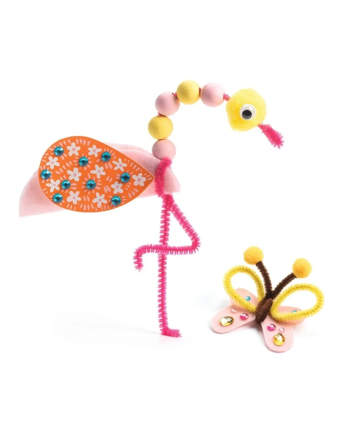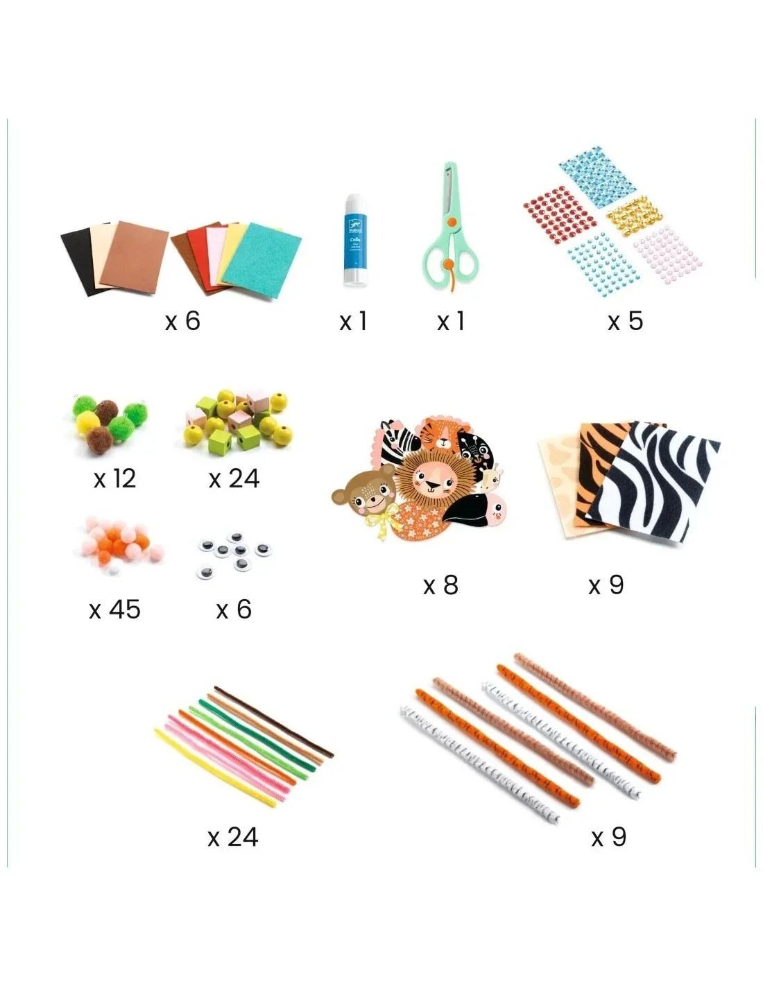 Inhoud: 10 voorgesneden geïllustreerde kaarten, 18 vellen vilt, 6 vellen schuim, 24 houten kralen, 45 pompons, 33 chenilledraden, zelfklevende sieraden, zelfklevende bewegende oogjes, 1 schaar, 1 tube lijm + 10 kaarten met ideeën