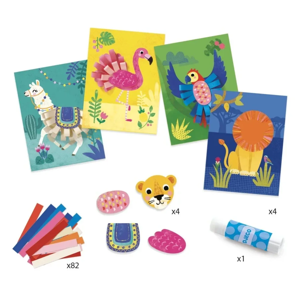 Een collage-activiteit om de dieren een driedimensionaal volume te geven door krullen te vormen. De kinderen maken volgens de aanwijzingen in het instructieboekje lussen met uitgeknipte papieren stroken en kleven deze op de kleurplaat. Daarna voegen de kinderen een groot stuk karton toe om de krullen bijeen te houden en te zorgen voor een mooie afwerking. De dieren krijgen dan een 3D-effect!