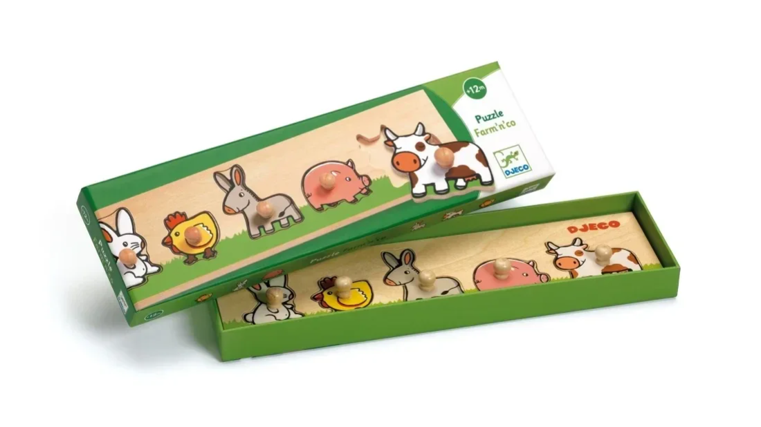 Farm'n'co is een houten puzzel in het thema van een boerderij. Elk stuk kan gemakkelijk worden vastgegrepen door kleine handjes dankzij de grote houten knoppen.Merk: DjecoLeeftijd: 12m+Inhoud: 5-delige houten puzzel met grote knoppen