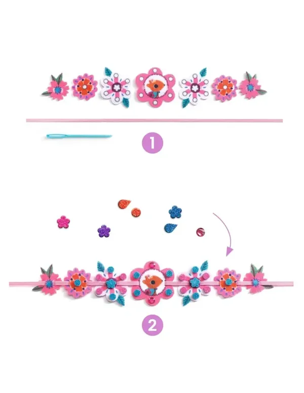 Inhoud: 28 stukjes vilt met voorgeperforeerde gaatjes (7 stukjes per armband), 4 stoffen elastieken, 4 vellen glitter foamstickers, 1 vel zelfklevende edelstenen, 4 naalden met ronde punt, 1 algemene stap-voor-stap-handleiding en 4 modellen om te volgen voor elke armband