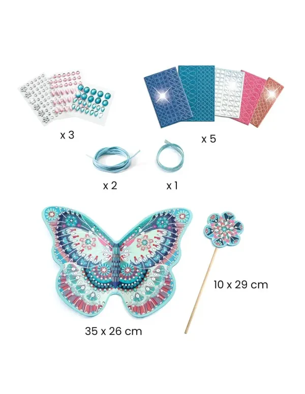 Inhoud: 1 paar geïllustreerde vleugels van stevig karton, 2 elastische banden, 1 toverstaf, 5 vellen foamstickers met glittermozaïek, 3 vellen edelsteenstickers, 1 gebruiksaanwijzing