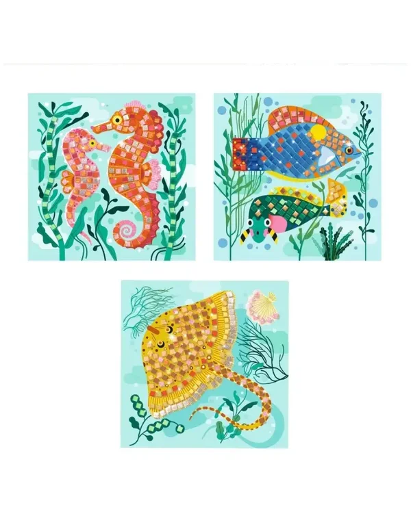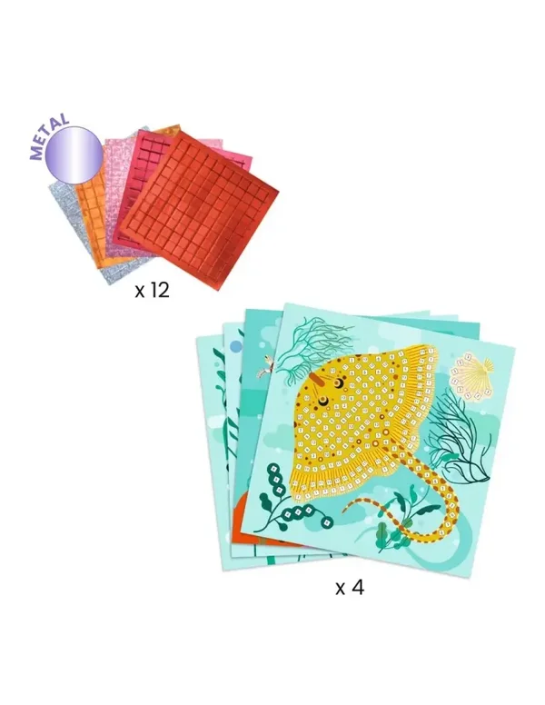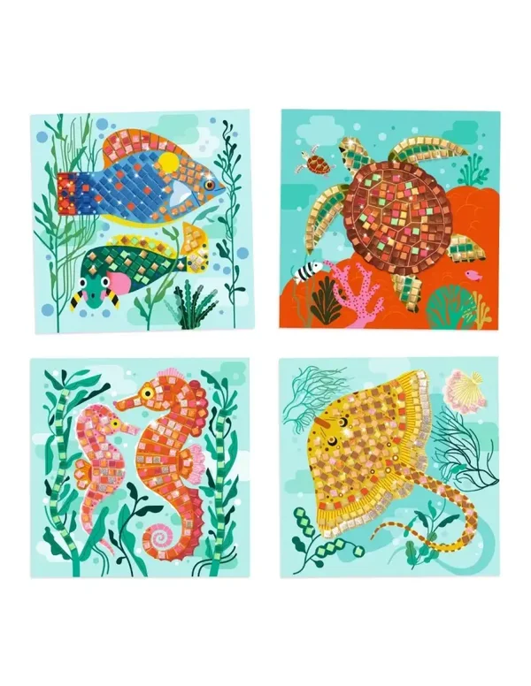 Een doos om kennis te maken met de kunst van mozaïek. 4 schilderijtjes om te versieren door er kleine vierkantjes van metallic foampapier op te plakken. Het kind volgt de nummers en plakt de juiste stickertjes op de aangeduide plek. De schilderijtjes worden opgevuld en de zeewereld gaat stralen.